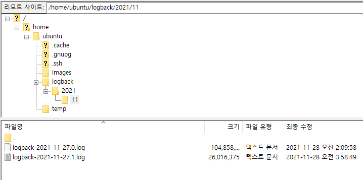 현재 2021/11 폴더에 11월 27일에 대한 로그가 쌓여있다