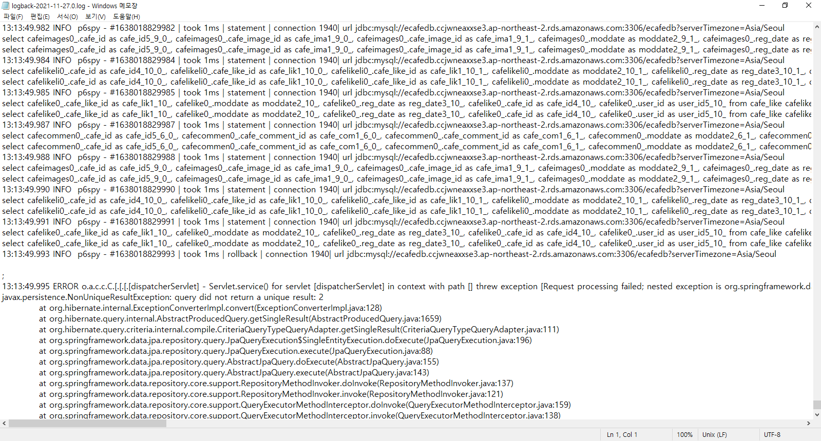 13:13:49.991 INFO p6spy - #1638018829991 | took 1ms | statement | connection 1940| url jdbc:mysql://ecafedb.ccjwneaxxse3.ap-northeast-2.rds.amazonaws.com:3306/ecafedb?serverTimezone=Asia/Seoul