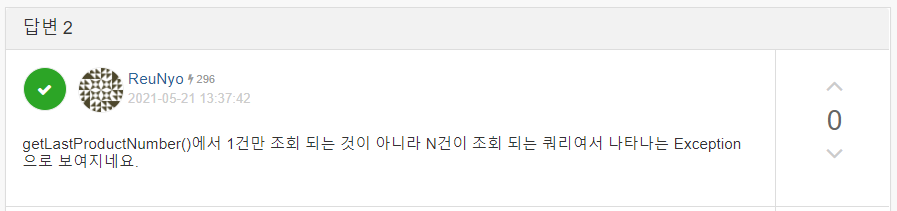 안녕하세요 선배님들! Product를 등록할때마다 ProductNumber 를 1씩 증가시켜서 DB에 저장할려고 합니다 그런데 두번째 리턴값부터 NonUniqueResultException:query did not return a unique result:2 라고 뜹니다.. 구글
