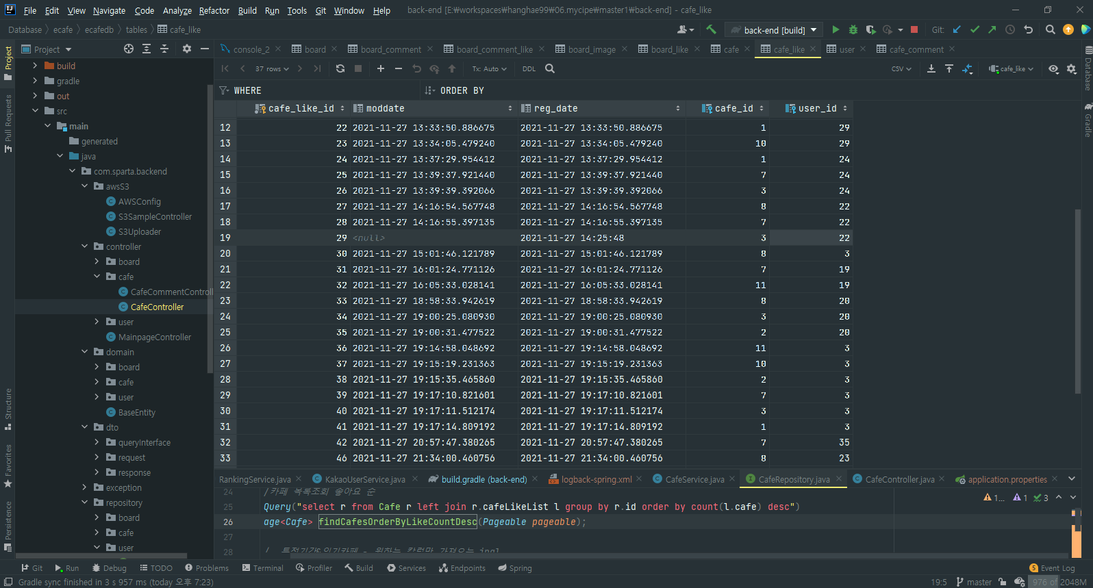 특히 'where cafe1_.cafe_id=3 and user2_.user_id=22;' 여기가 의심스러웠다