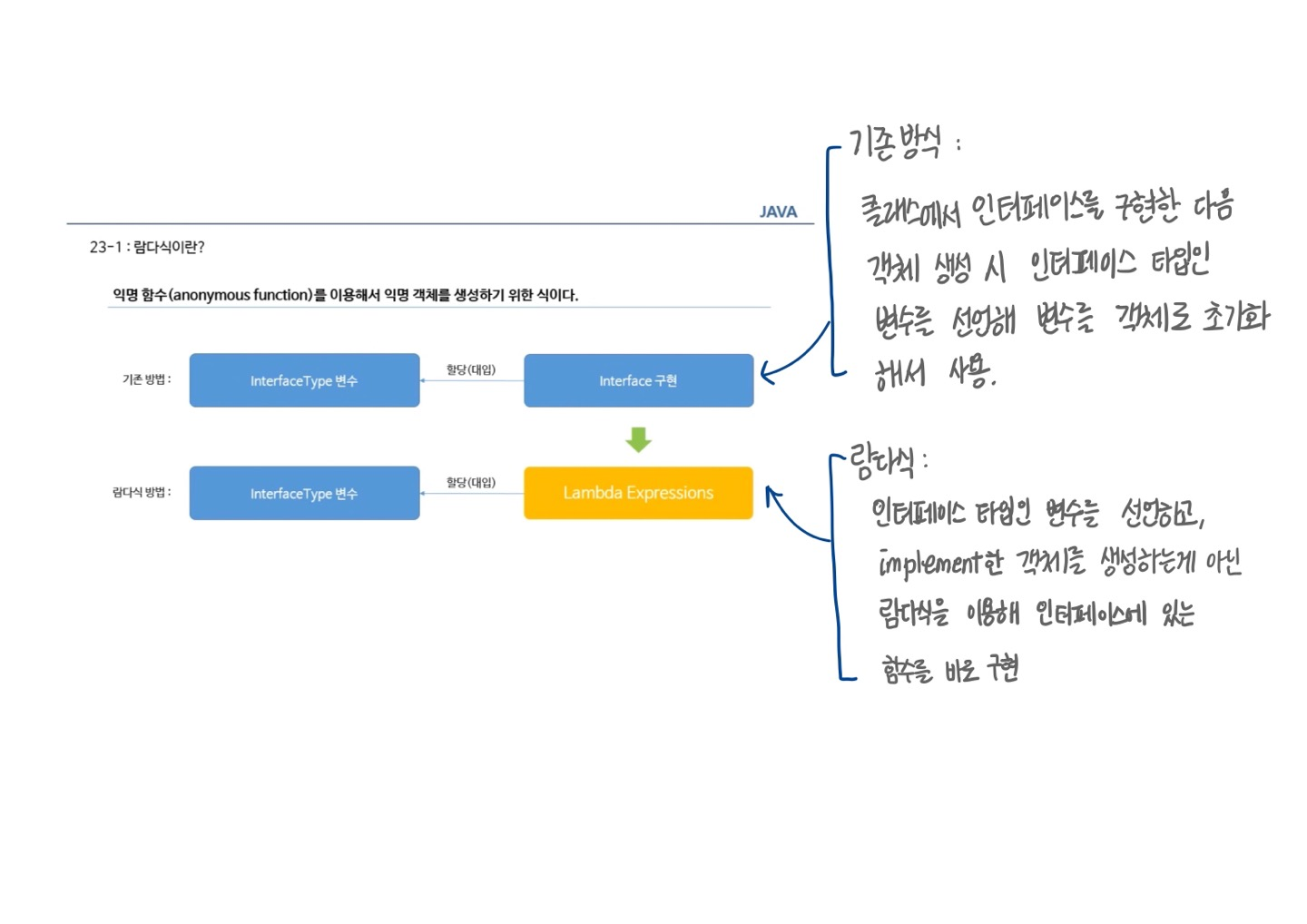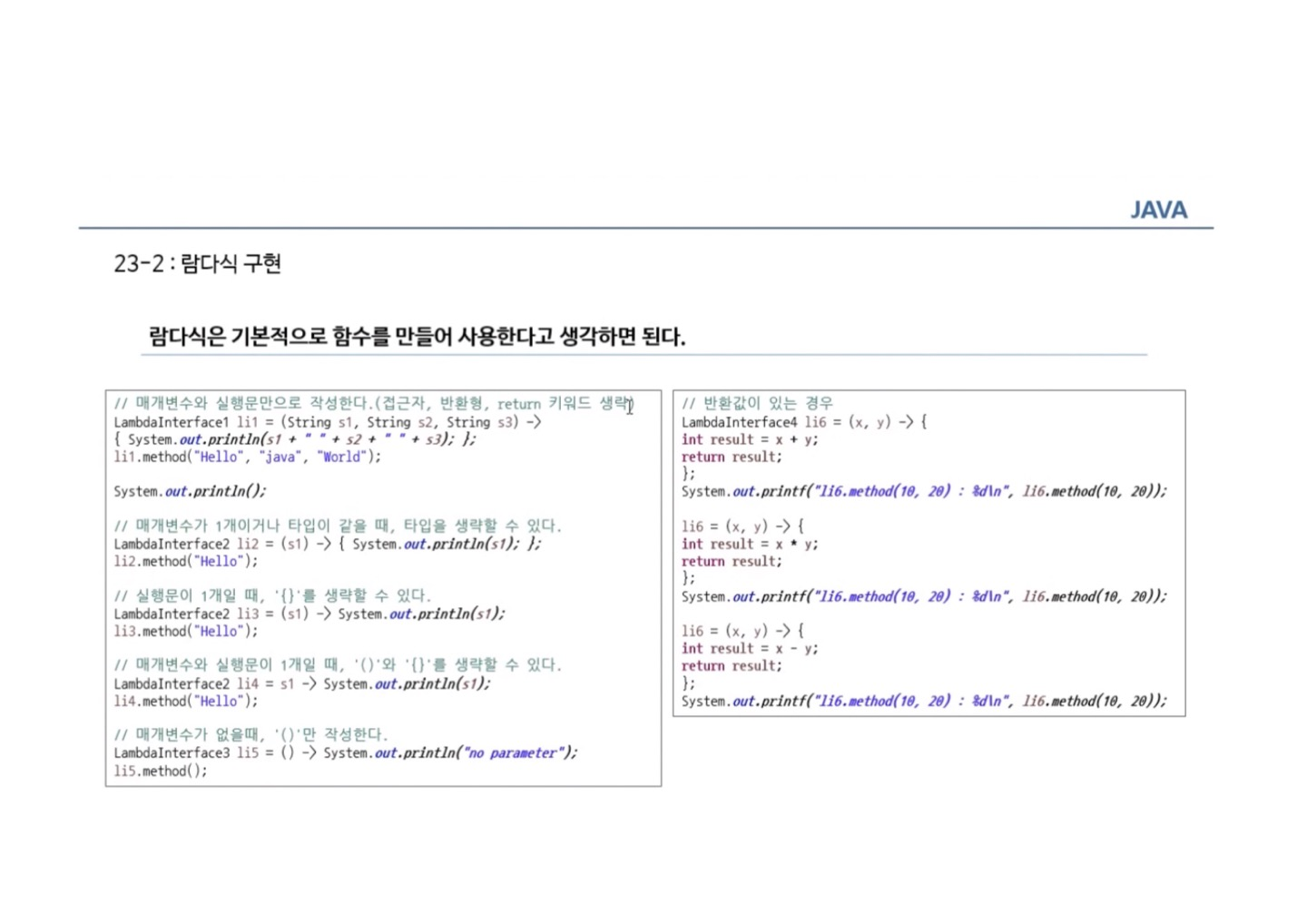 - 인터페이스 타입인 변수를 선언하고, implement한 객체를 생성하는 게 아닌! 람다식을 이용해 인터페이스에 있는 함수를 바로 구현